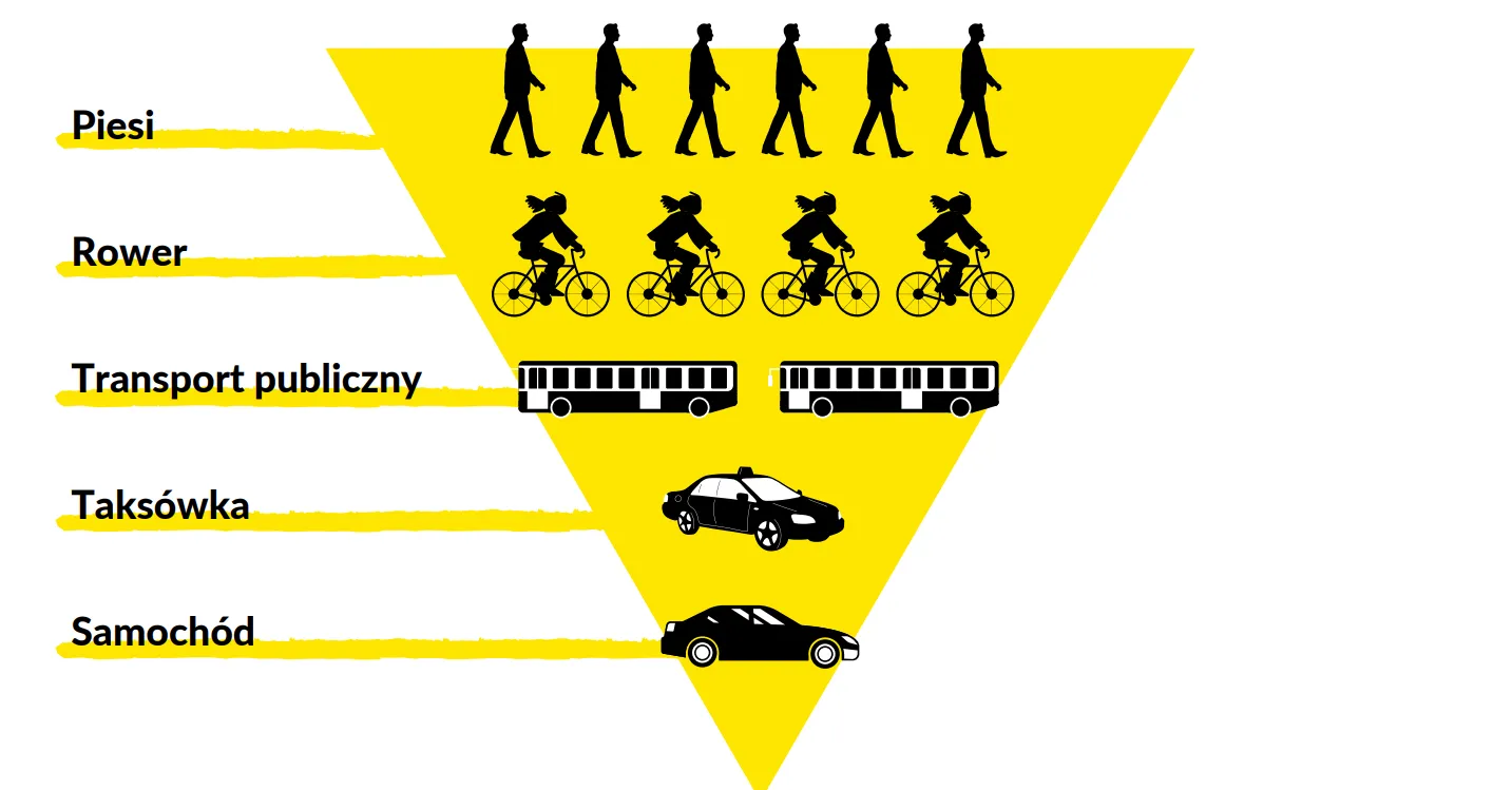 Jedynie przemieszczanie się pieszo czy rowerem jest w 100% bezemisyjne. Dlatego to właśnie ruch pieszy i rowerowy powinien stanowić podstawę naszej mobilności. Doskonale pokazuje to tzw. odwrócona piramida mobilności zaprezentowana w 2011 r. przez kopenhaskie stowarzyszenie Bicycle Innovation Lab.