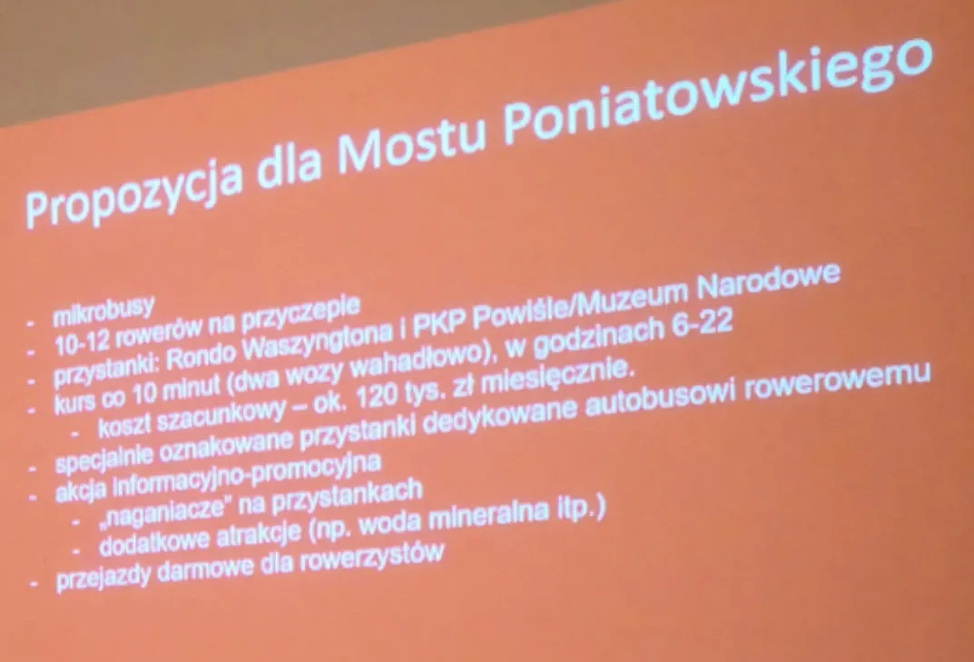 Na spotkaniu Branżowej Komisji Dialogu Społecznego urzędnicy ZDM zaprezentowali "innowacyjny" pomysł na poprawę bezpieczeństwa rowerzystów na Moście Poniatowskiego. Według ich propozycji rowerzyści chcący pokonać most, mogliby przesiąść się do dedykowanego mikrobusa a rower zostałby załadowany na przyczepkę. W ten sposób bezpiecznie dotarliby na drugą stronę rzeki, nie ryzykując, że wpadną pod koła rozpędzonego samochodu.