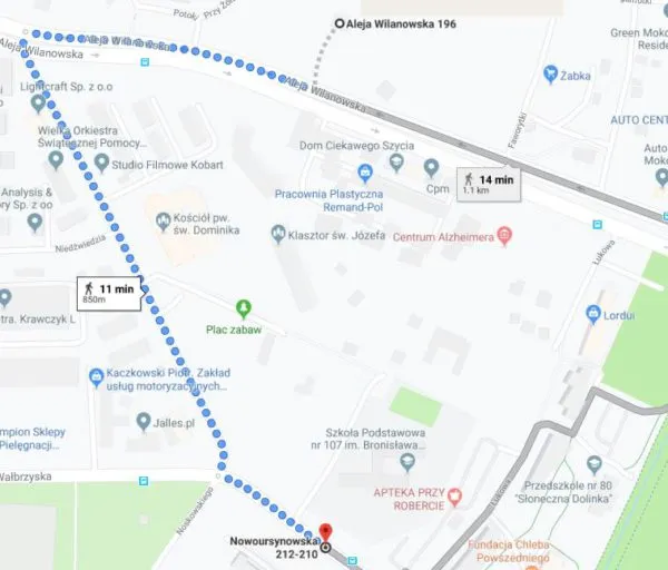 Jakżeby inaczej – 1 km, a więc przekroczenie dopuszczalnego wymogu o dwieście metrów. Jeśli spojrzymy na mapę załączoną przez dewelopera, to oczywiście nie pokazuje ona trasy do wejścia szkoły, a jedynie do ogrodzenia. Jak wiadomo, każdy szanujący się uczeń wchodzi do szkoły, przeskakując przez płot chcąc być cool, a nie grzecznie po chodniku i obok woźnego. Ale OK, sprawdźmy i taki wariant.