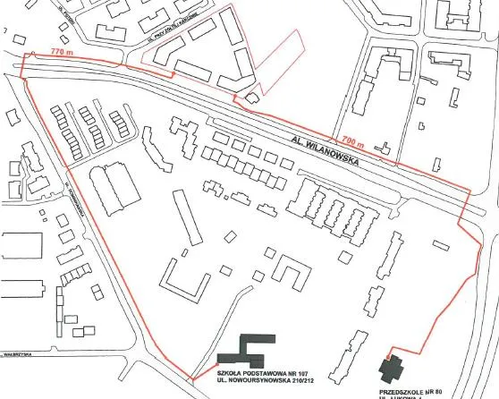W ramach ukłonów w stronę dbałości o planowanie przestrzenne (☺) PiS na ostatniej prostej dodał do ustawy wymóg istnienia szkoły w okolicy, aby zapobiec budowania osiedli pośrodku pola buraków cukrowych. Zatem aby inwestycja mogła być procedowana w trybie Lex Deweloper, musi być zachowana określona odległość od najbliższej szkoły i przedszkola. Inaczej inwestycja w ogóle nie spełnia wymogów formalnych. Warszawa ustaliła w standardach urbanistycznych, że odległość ta nie może być większa niż 800 metrów. We wniosku załączonym przez Greenfields znajdujemy enigmatyczną informację o „około 770 metrach”
