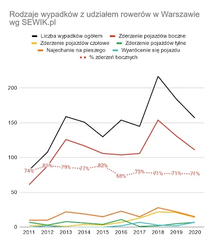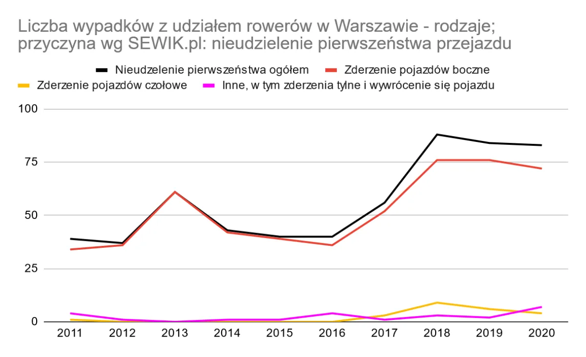Nie jest zatem prawdziwa zawarta w artykule “Gazety Wyborczej” sugestia, że w Warszawie przybywa wypadków z udziałem rowerzystów, rzekomo dlatego, że rowerzystów jest coraz więcej. W latach 2013-2017 rowerów na ulicach stale i zauważalnie przybywało, a roczna liczba wypadków utrzymywała się na poziomie ok. 150, z niewielkimi odchyleniami. Skokowy wzrost miał miejsce w 2018 roku. Zaś w latach 2019-2020 w statystykach widać już trend spadkowy.