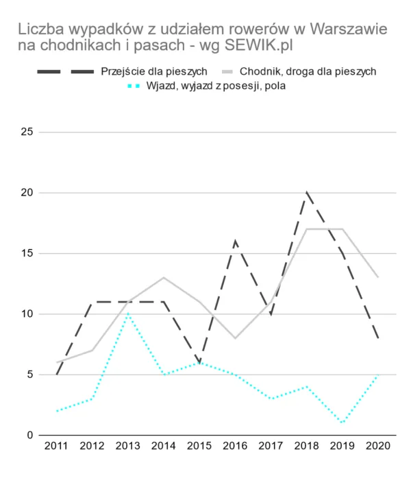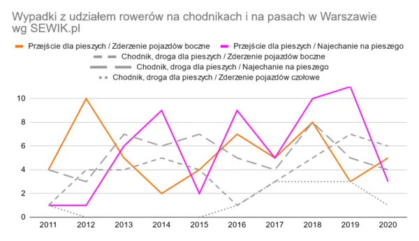 Przez 10 lat nie da się zobserwować żadnego wyraźnego trendu wzrostowego różnego rodzaju zdarzeń z udziałem rowerów, do których dochodzi na chodnikach i na przejściach dla pieszych. Trzeba to bardzo mocno podkreślić: rowerzyści nie sieją na chodnikach coraz większego "spustoszenia" wśród pieszych. Nie zderzają się też na nich coraz częściej ani między sobą, ani z innymi pojazdami. Pewnym problemem, na który warto zwrócić uwagę jest ustępowanie przez rowerzystów pierwszeństwa pieszym na zebrach. W 2020 roku były 3 takie wypadki - we wszystkich za winnych uznani zostali rowerzyści - lecz w przeszłości bywało i ok. 10 rocznie.