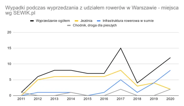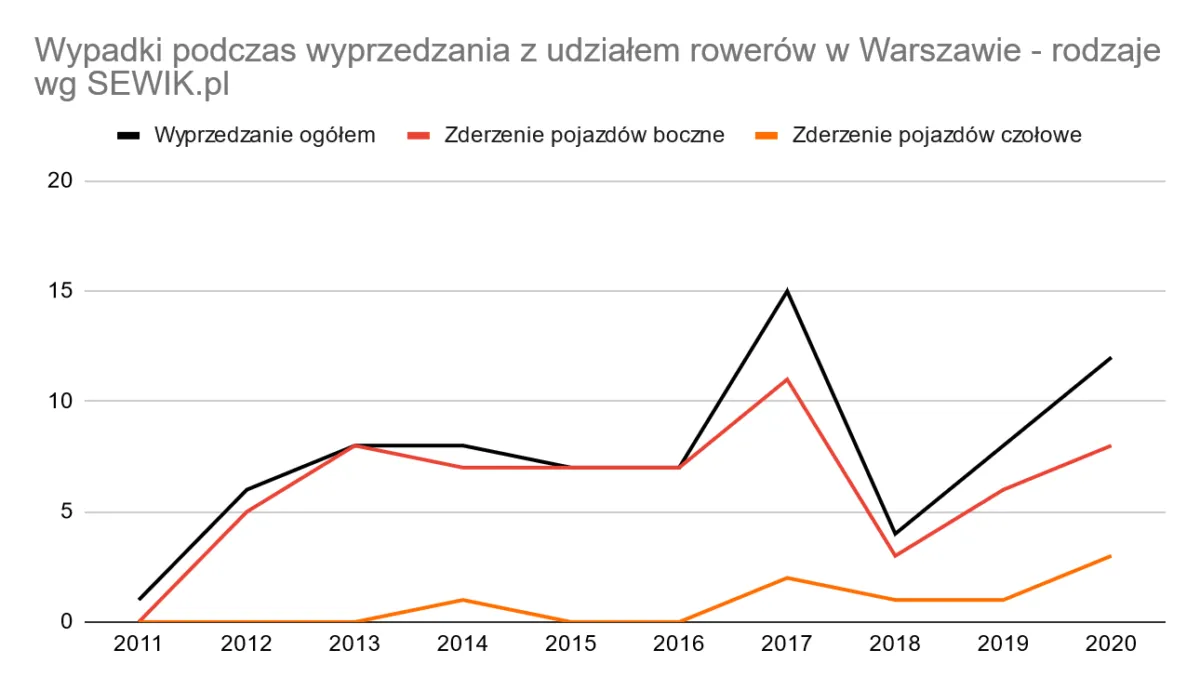 Osoby jeżdżące na rowerach najbardziej boją się nieprawidłowego wyprzedzania. Jednak według statystyk są to sytuacje równie nieliczne, jak wypadki na chodnikach. Tylko 10 razy Policja uznała nieprawidłowe wyprzedzanie jako przyczynę wypadku tylko w 2017 i w 2020 roku. Wypadki te były kwalifikowane przeważnie jako zderzenia boczne.