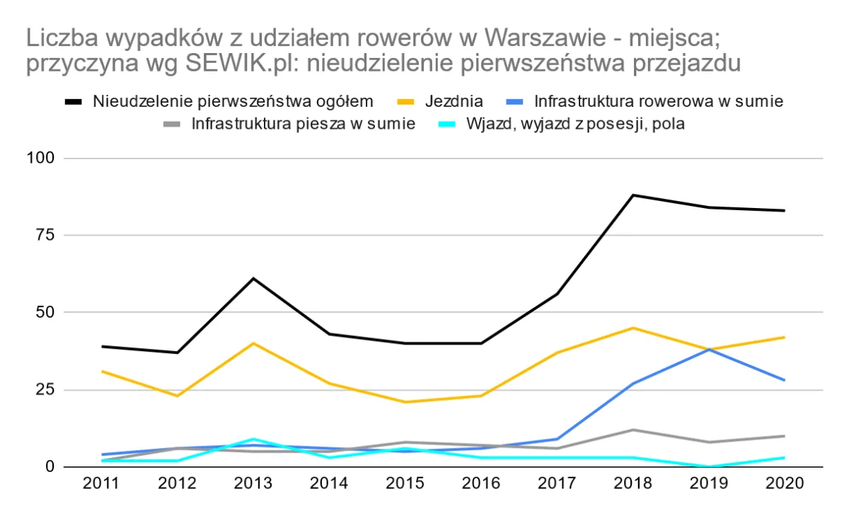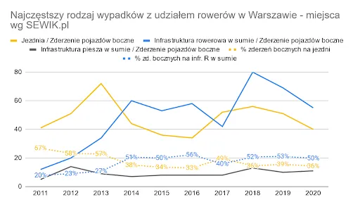 Za skok z poziomu ok. 150 wypadków rocznie do powyżej 200 w 2018 r. odpowiadał gwałtowny wzrost liczby wypadków na infrastrukturze rowerowej, czyli na pasach, drogach i przejazdach dla rowerów. Warto podkreślić, że pomimo rosnącego udziału ruchu rowerowego i rosnącej proporcjonalnie liczbie rowerzystów korzystających z jezdni, nie wzrasta liczba wypadków z udziałem rowerów na jezdniach.