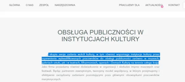 Firma K. Pisze o sobie “K. (...) wspomaga instytucje kultury przez zapewnienie wykwalifikowanych pracowników do obsługi publiczności zarówno w muzeach, galeriach sztuki, jak i w teatrach, filharmoniach, operach i Domach Kultury na terenie całego kraju”.