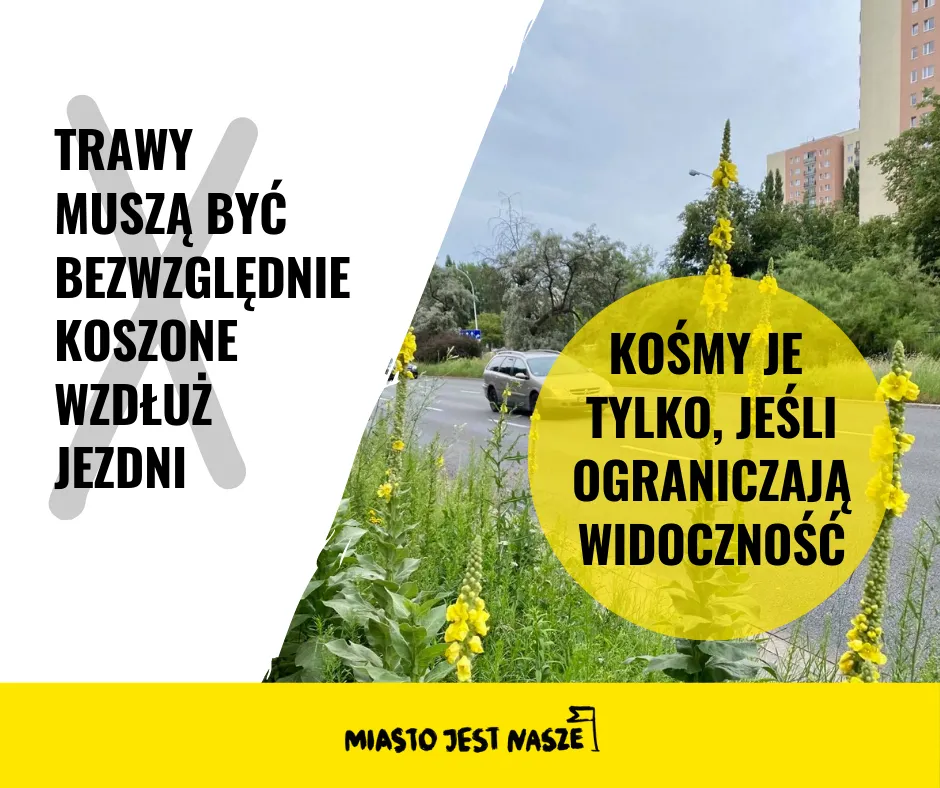 O ile nie mamy żadnych zastrzeżeń do koszenia w miejscach, gdzie wysoka trawa mogłaby zakłócić bezpieczeństwo ruchu drogowego, to w takich punktach jak pasy zieleni rozdzielające jezdnie przeważnie wysoka trawa w niczym nie przeszkadza. Hurtowe koszenie wszystkich stref w pobliżu jezdni jest zwykle podporządkowane wygodzie wykonawcy prac pielęgnacyjnych. Rozwiązaniem, które zapewni bezpieczeństwo i jednocześnie zabezpieczy trawę, może być jej koszenie maksymalnie metr w głąb od krawędzi jezdni.