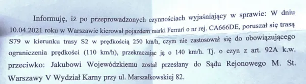 Przypomnijmy: 11 kwietnia ubiegłego roku Kuba wrzucił na swojego instagrama zdjęcie ze sportowym samochodem gdzie na liczniku widać prędkość 250 km/h. Napisał “obiecałem mamie że wrócę szybko”. Tym samym wrzucił dowód na to, że złamał ograniczenie prędkości o …140 km/h, bo jechał po drodze ekspresowej. Dostarczyliśmy to zdjęcie na policję jako dowód na złamanie przepisów.