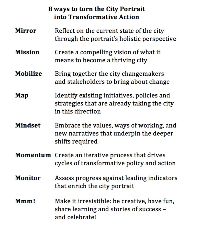 Następnie, postawione zostają cztery szczegółowe pytania będące “soczewkami” miasta. Odpowiedzi na nie tworzą jego „portret” z czterech wzajemnie powiązanych perspektyw: społecznej, ekologicznej, lokalnej i globalnej. Ułatwiają one wyznaczenie celów polityki miejskiej na kolejne lata.