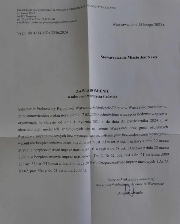 W analogicznej sytuacji prokuratura i Policja w Poznaniu skutecznie rozbiły podobną grupę. U nas jednak organy państwowe wykazały znacznie mniej determinacji. W lutym tego roku otrzymaliśmy informację, że prokuratura odmówiła wszczęcia postępowania w naszej sprawie. Podobną decyzję podjęto wcześniej w odpowiedzi na zawiadomienie złożone przez Komendę Stołeczną Policji, mimo że prowadzone były szeroko zakrojone działania operacyjne, w tym infiltracja grupy i wystawienie ponad 300 mandatów podczas jednego z wydarzeń. W naszej sprawie — co jeszcze bardziej kuriozalne — prokuratura doręczyła nam decyzję bez ustawowo wymaganego uzasadnienia. Uznano, że nie mamy przymiotu strony, mimo że członkom naszej organizacji grożono karalnie, a od lat prowadzimy działania na rzecz poprawy bezpieczeństwa ruchu drogowego. Dopiero po złożeniu skargi na sposób procedowania otrzymaliśmy pełną dokumentację. Warto podkreślić, że bez uzasadnienia niemożliwe jest skuteczne wniesienie zażalenia na postanowienie prokuratury. Trudno nie odnieść wrażenia, że celowo próbowano pozbawić nas możliwości działania.