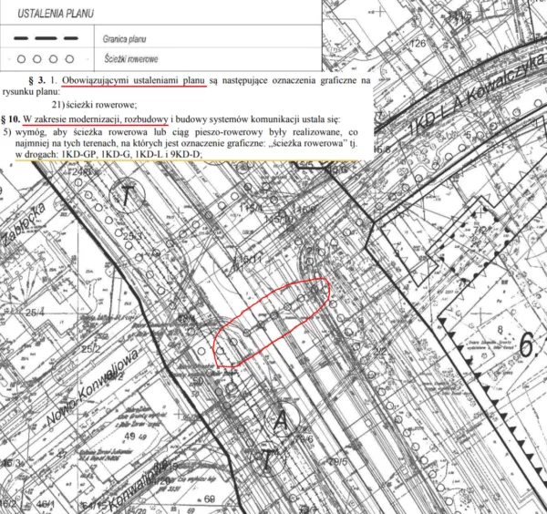 Brak przejazdu rowerowego po południowej stronie skrzyżowania i przejścia dla pieszych jest również niezgodny z ustaleniami miejscowego planu zagospodarowania przestrzennego rejonu ulic Morelowej i Kowalczyka przyjętego uchwała nr XC/2311/2014 Rady Miasta Stołecznego Warszawy z dnia 11 września 2014 r.: W zakresie modernizacji, rozbudowy i budowy systemów komunikacji ustala się: