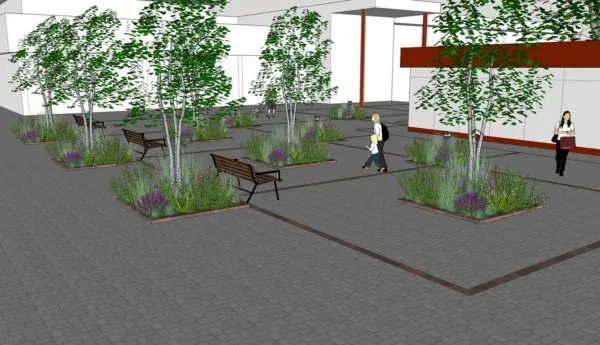 Na zieleń złożą się drzewa, uzupełnione o nasadzenia z wysokich traw, krzewów i kwiatów. Niestety w projekcie nie starczyło funduszy na wymianę kostki brukowej. Może jednak władze dzielnicy, zachęcone nowym obliczem tej przestrzeni, zechcą i na to sypnąć parę groszy?