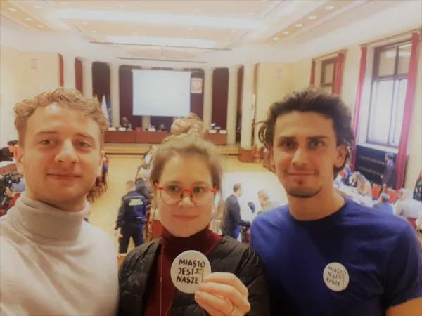 Reprezentacja MJN w składzie: od lewej: Beniamin Łuczyński, Zuzanna Glińska, Bartłomiej Gołąbek na sesji Rady Warszawy, na której radni przegłosowali przyjęcie uchwały krajobrazowej.[/caption]