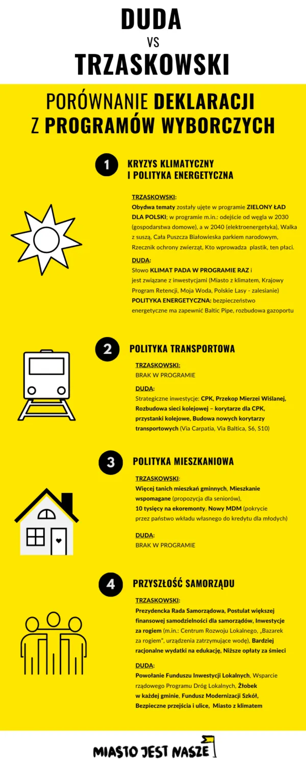 Niestety nie doczekaliśmy się debaty Andrzeja Dudy i Rafała Trzaskowskiego przed drugą turą wyborów. Debaty indywidualne kandydatów, które odbyły się kilka dni temu, również nie przyniosły odpowiedzi na najważniejsze dla nas pytania. Dlatego jako wyborcy i mieszkańcy Warszawy postanowiliśmy sprawdzić poglądy kandydatów na prezydenta przed II turą wyborów, skupiając się na obszarach strategicznych dla naszego ruchu i dla przyszłości polskich miast.