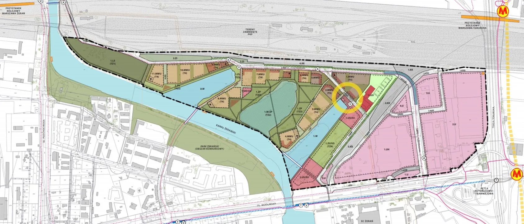 Poniższy rysunek przedstawia fragment Kanału Żerańskiego i Port Żerański. Co prawda mapka jest zorientowana nietypowo (północ jest po lewej), ale chyba łatwo się w niej rozeznać. Tereny na zachód od kanału (czyli „na dole” na ilustracji) są już częściowo zagospodarowane budownictwem mieszkaniowym. Natomiast tereny pomiędzy kanałem a torami kolejowymi dopiero czekają na zagospodarowanie.