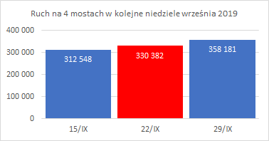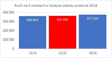 W ostatnich latach - za wyjątkiem szczególnego z powodu pandemii koronawirusa roku 2020 - dzień bez samochodu wypadał w weekendy. Zarząd Transportu Miejskiego wraz z pracującymi na jego zlecenie spółkami organizował w te dni pikniki, prezentacje taboru i inne podobne atrakcje. Teraz także trwają “Dni Transportu Publicznego”, które sprowadzają się do akcji widocznych tylko dla ludzi zainteresowanych takimi akcjami. Nie ma to żadnego wpływu na natężenie ruchu na mostach. Cztery z 8 stacji na warszawskich mostach działają w trybie automatycznym - ciągle, 24 godziny na dobę, przez cały rok. Są to stacje na mostach M. Curie-Skłodowskiej, Grota - Roweckiego, Gdański i Łazienkowski. Średnio w ciągu całego typowego dnia tygodnia przez te 4 mosty przejeżdża ponad 2/3 pojazdów przekraczających Wisłę w Warszawie. Wskaźnik ten ma bardzo niewielkie odchylenia w kolejnych latach - od 66,9% w 2017 do 68,3% w 2019 r. Dane z połowy mostów stanowią więc również dobry miernik ruchu w mieście. Wyniki dowodzą, że “akcje” miasta nie dały żadnych mierzalnych efektów w weekendy z dniami bez samochodów ani w 2018, ani w 2019 r.