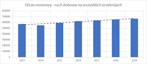 Miały na to wpływ różne czynniki. Na wykresie widać też jednak powód odwrócenia się trendu. Było to oddanie do ruchu nowego mostu, mostu północnego, im. Marii Skłodowskiej-Curie. Trend spadkowy był przed realizacją przez Zarząd Miejskich Inwestycji Drogowych programu budowy powiązań “węzła komunikacyjnego jakim jest miasto Warszawa” z międzynarodowymi sieciami TEN-T (przykład>>> ), przed przebudową mostu na Trasie Toruńskiej do standardu ekspresowego (S8), przed oddaniem do użytku zupełnie nowego mostu na obwodnicy południowej (S2). Nie mogło to mieć efektu innego niż powrót stałego trendu zwiększania ruchu, mierzonego najbardziej miarodajnie właśnie na wybranym przez ZM do analizy tzw. “ekranie mostowym”.