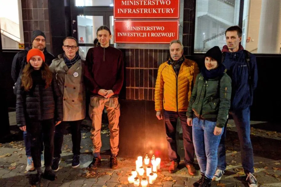 Po tragicznym wypadku na ul. Sokratesa poszliśmy pod gmach Ministerstwa Infrastruktury, gdzie znajduje się siedziba Krajowej Rady Bezpieczeństwa Ruchu Drogowego. W dniu pamięci ofiar wypadków drogowych (17 listopada). Zapaliliśmy znicze ułożone w kształt cyfry osiem – każdego dnia ginie bowiem średnio 8 osób na polskich drogach – oraz upamiętniliśmy minutą ciszy ofiary wypadków.