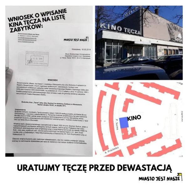 Złożyliśmy pismo do Stołecznego Konserwatora Zabytków w sprawie wpisania kina Tęcza do Gminnej Ewidencji Zabytków. Mamy nadzieję że uchroni to Tęczę od dalszej degradacji. Trzymamy też kciuki, by obiekt zyskał nowe życie - kulturalne i społeczne, jak dawniej.