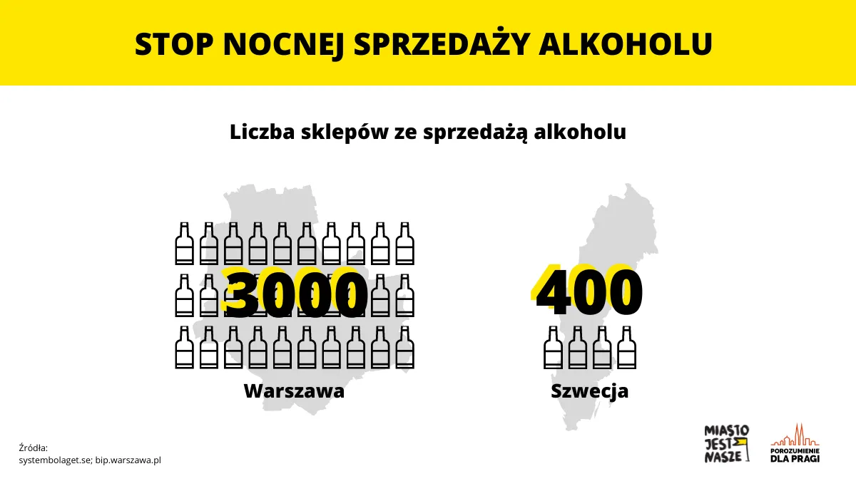- Rada Warszawy powinna wprowadzić zakaz sprzedaży napojów alkoholowych w sklepach i na stacjach benzynowych w godzinach 22:00-6:00 na terenie całej Warszawy. Zakup i spożywanie alkoholu w godzinach nocnych nadal byłby możliwy w lokalach gastronomicznych, barach czy klubach.