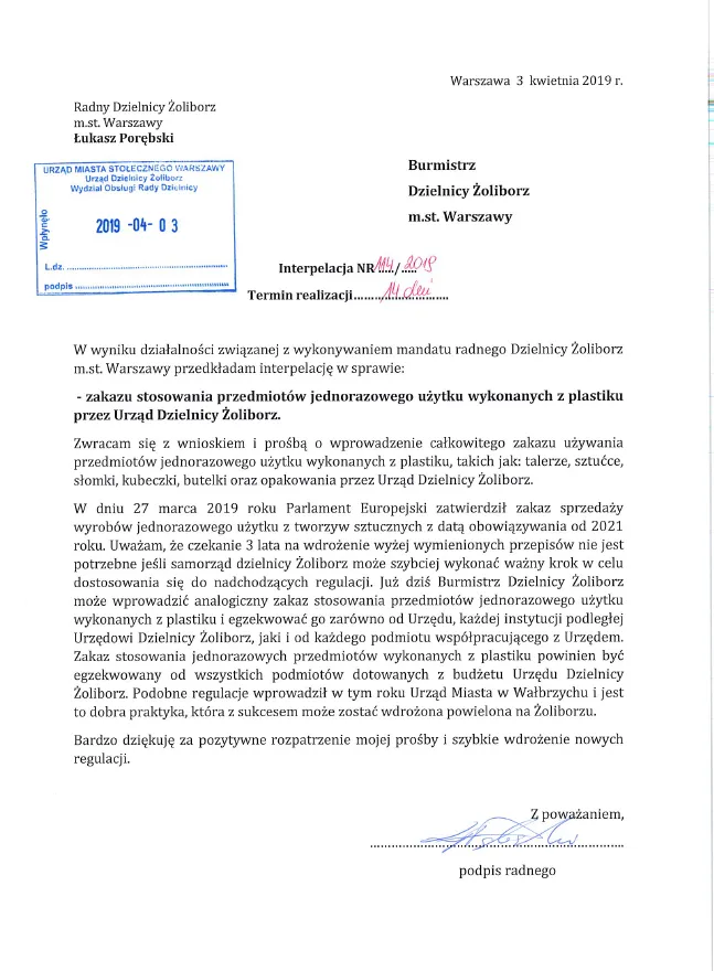3 kwietnia radny MJN Łukasz Porębski wystąpił do burmistrza Michalca z wnioskiem o zakaz stosowania przedmiotów jednorazowego użytku wykonanych z plastiku przez Urząd Dzielnicy Żoliborz.